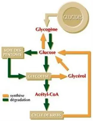 Le glycogène est composé de molécules de glucose, réunies en longues chaînes. Si les réserves de glycogène dans le corps sont normales, les glucides en excès qui entrent dans le corps sont convertis en graisses.